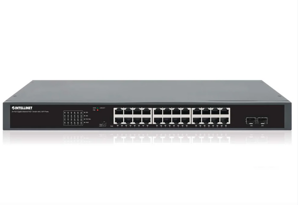 The Intellinet Network Solutions 24-Port Gigabit Ethernet PoE+ Switch with 2 SFP Ports passes both data and electrical power to a number of PoE-compatible devices via standard Cat5e or Cat6 network cables. Equipped with 24 Gigabit Ethernet ports, this switch can power wireless LAN access points and bridges, VoIP phones, IP video cameras and more while delivering network speeds up to 1,000 Mbps.