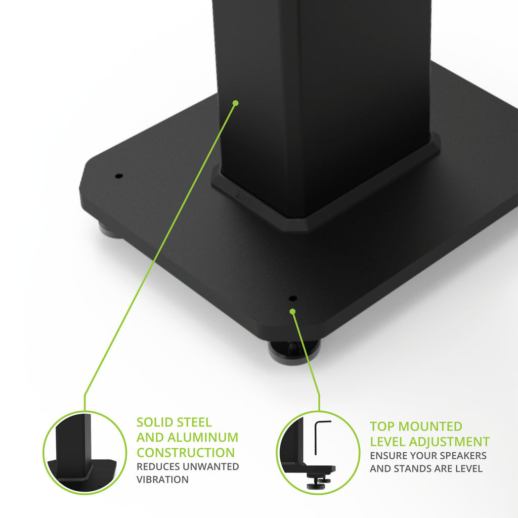 The SX series of premium floor-standing speaker stands with a bespoke isolation system, decouples the speaker stands from the floor for class-leading audio performance. The leveling system accessible from the top of the base plate, combined with the included bullseye level lets you adjust level with ease. The heavy-duty base plates provide the perfect platform with a dedicated channel for cable management and a separate, spacious column to fill provided bags with the substrate of your choice. Hard floor discs with silicone pads protect wooden floors and optional top plate adhesive foam pads improve dampening. Available in 22” or 26” tall models and black or white finishes to match any space or aesthetic