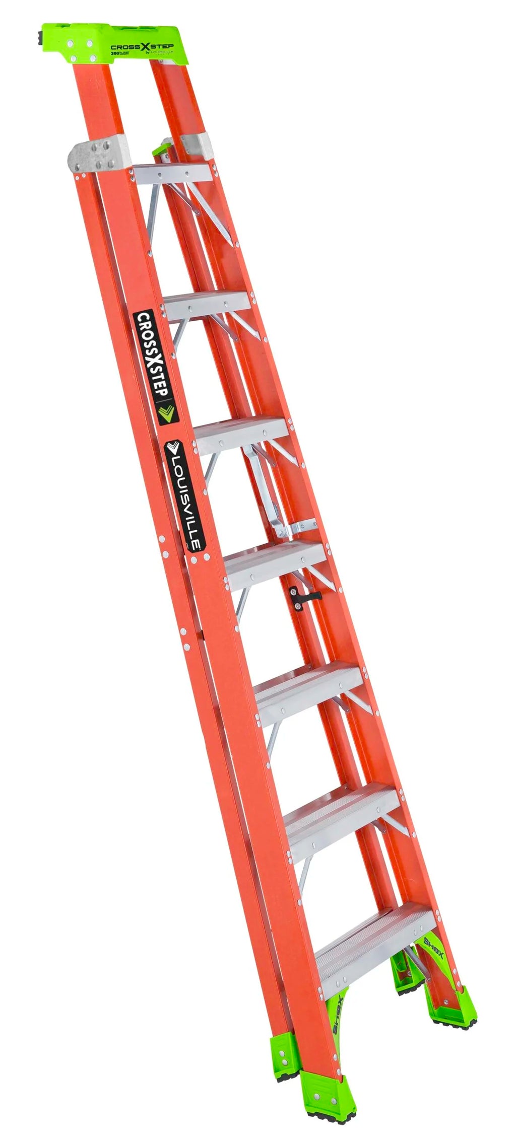 The industry changing Step-to-Extension 2-in-1 Cross Step Ladder is better than ever! Its HiVis green top and shoes makes it easily identifiable to prevent fines and improve workplace safety. SUPERIOR QUALITY: This 8-Foot Cross-Step/Shelf Ladder is made of superior quality, non-conductive fiberglass VERSATILE: Converts from a step ladder into a shelf ladder for a 2 in 1 combination in order to get closer to the work area PATENTED PROTOªP SYSTEM: V-shape ProTopª allows the ladder to lean against walls, buildings and poles; and has plenty of features to improve performance when working electrical, construction, and residential jobs. It includes a magnet tray, hardware tray, drill and tool slots, and pipe or 2_4 holder. EQUIPPED WITH SHOXª SYSTEM: Louisville Ladder exclusive SHOXª system provides extra durability and resistance to abuse and accidental mishandling. STURDY AND STRONG: With its 300-Pound capacity, elegant design and smooth finish, you wonÕt find a more durable, reliable ladder. ABOVE AND BEYOND SAFETY STANDARDS: This ladder meets or exceeds the safety standards set by ANSI and OSHA.